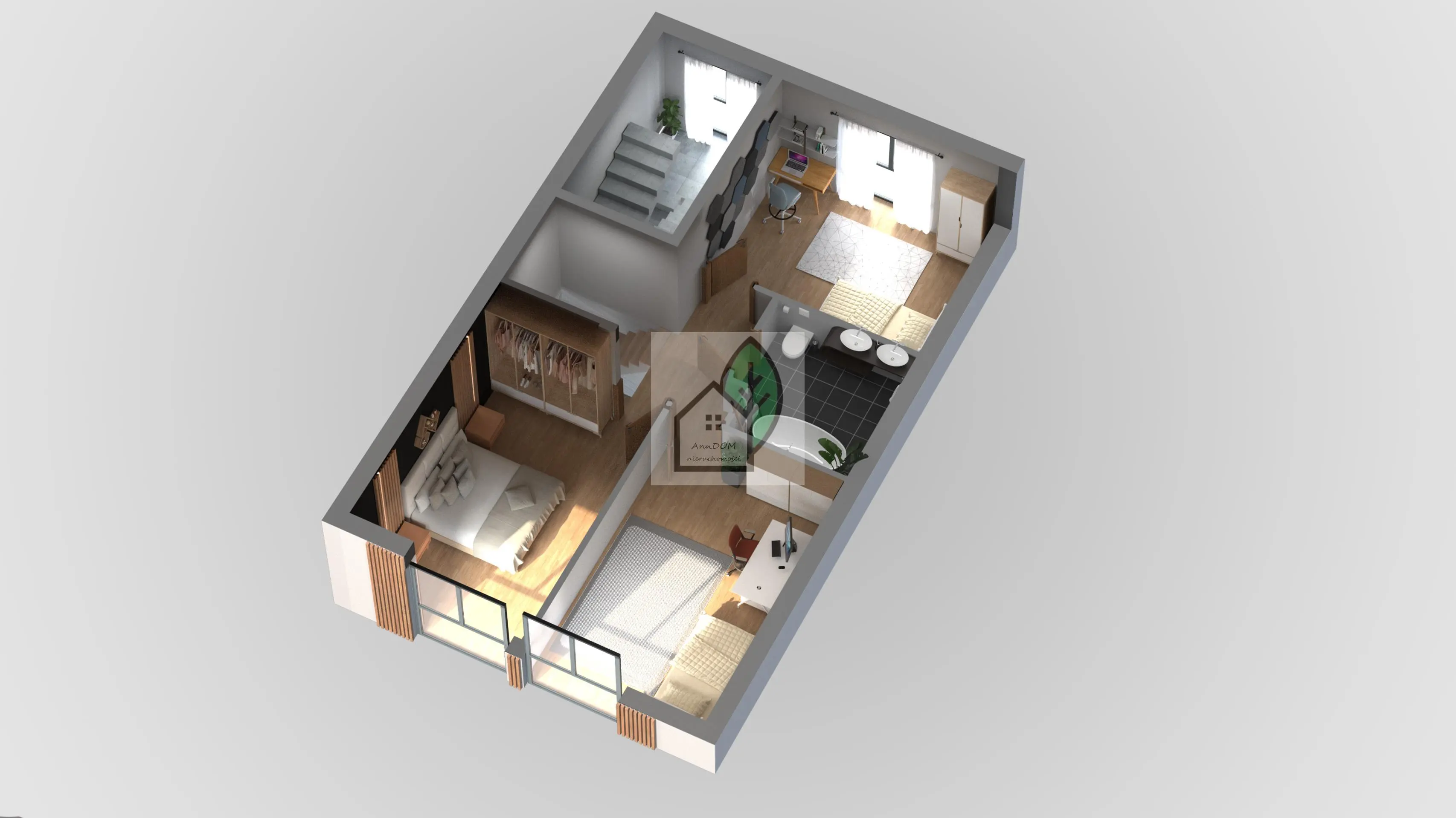1. poziom: przestronny salon z aneksem kuchennym łazienka z wanną i balkon
